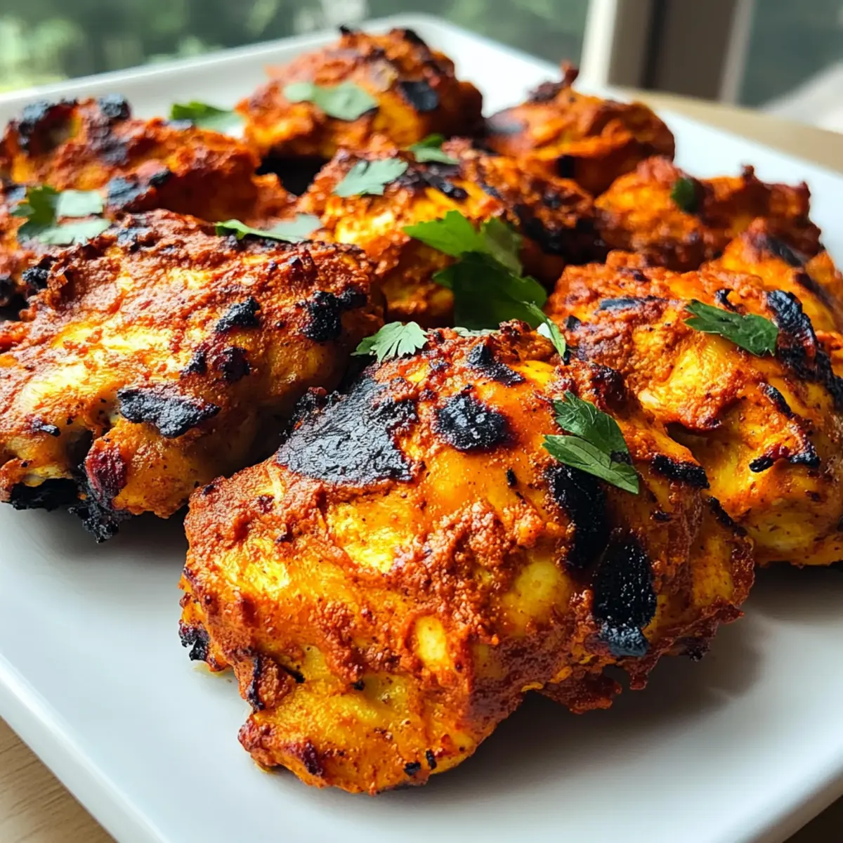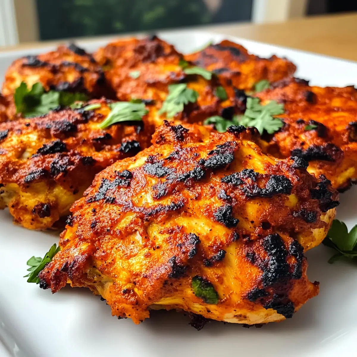 Während ich in der Küche stehe und die Gewürze sorgfältig abmesse, um das perfekte Tandoori-Hühnchen zuzubereiten, überkommt mich das Gefühl von Vorfreude. Diese köstliche indische Spezialität vereint zarte Hühnchenteile mit einer cremigen Joghurtmarinade und einer großzügigen Portion exotischer Gewürze. Das Beste daran? Es ist nicht nur einfach zuzubereiten, sondern auch eine großartige Option für alle, die sich kohlenhydratarm ernähren möchten. Die Kombination aus aromatischem Geschmack und einer leicht angebräunten Oberfläche wird selbst die skeptischsten Esser begeistern! Perfekt für gemütliche Familienessen oder feierliche Anlässe, bietet das Tandoori-Hühnchen die Möglichkeit, das Essen zu einem unvergesslichen Erlebnis zu machen. Neugierig, welche geheimen Tricks ich für das optimale Ergebnis verwendet habe? Lass uns gemeinsam in die Welt des indischen Kochens eintauchen! Warum ist dieses Tandoori-Hühnchen besonders? Einfache Zubereitung: Diese Rezeptur erfordert lediglich grundlegende Kochkünste, perfekt für jeden, der ein schnelles, yet köstliches Gericht zaubern möchte. Aromatische Gewürze: Die Kombination aus Gewürzen wie Cayenne und Kreuzkümmel bietet ein unvergleichliches Geschmackserlebnis. Vielseitigkeit: Ob du es schärfer magst oder die mildere Version bevorzugst, du kannst die Gewürze ganz nach deinem Geschmack anpassen. Gesunde Option: Mit seiner kohlenhydratarmen Rezeptur ist dieses Gericht ideal für alle, die auf ihre Ernährung achten. Beeindruckende Präsentation: Das Tandoori-Hühnchen ist nicht nur lecker, sondern sieht auch fantastisch aus, perfekt für besondere Anlässe oder um Gäste zu beeindrucken. Wenn du weitere kreative Ideen zu knusprigem Hühnchen suchst, schau dir mein Rezept für Knuspriges Parmesan Huehnchen an! Tandoori-Hühnchen Zutaten Hinweis: Für ein authentisches Tandoori-Hühnchen Erlebnis benötigst du erstklassige Zutaten! Für die Marinade Hühnchen Oberschenkel – Die saftige Hauptquelle für Protein sorgt für zartes Fleisch. Du kannst auch Hühnerbrust verwenden, aber diese wird schneller trocken. Joghurt – Die Basis der Marinade, die das Hühnchen zart macht und köstlichen Geschmack hinzufügt. Für eine leichtere Variante kannst du fettarmen Joghurt verwenden. Limettensaft – Bringt Frische und hilft, das Hühnchen zusätzlich zu zartem Fleisch zu machen. Salz & Pfeffer – Unverzichtbare Gewürze für die geschmackliche Abrundung. Passt die Menge an deine Vorlieben an. Für die Gewürzmischung Cayennepfeffer – Verleiht dem Gericht Schärfe; variiere die Menge nach deinem persönlichen Schärfegrad. Kreuzkümmel – Dieser Geschmacksträger ist ein Muss für die Tandoori-Gewürzmischung. Korianderpulver – Ergänzt die Mischung um eine frische Note, die das Aroma abrundet. Für die Zubereitung Öl (Pflanzenöl oder Ghee) – Gibt Feuchtigkeit und sorgt für eine knusprige Oberflächenstruktur beim Grillen oder Braten. Schritt-für-Schritt-Anleitung für Tandoori-Hühnchen Schritt 1: Hühnchen vorbereiten Reibe die Hühnchenoberschenkel großzügig mit Salz, Pfeffer und Limettensaft ein. Diese Schritte sind entscheidend, um das Fleisch zu würzen und zart zu machen. Lasse das Hühnchen für etwa 15 Minuten ruhen, damit die Aromen einziehen können. Währenddessen kannst du mit der Marinade beginnen. Schritt 2: Marinade zubereiten Vermische in einer großen Schüssel den Joghurt mit Cayennepfeffer, Kreuzkümmel und Korianderpulver, bis alles gut verbunden ist. Achte darauf, dass die Gewürze gleichmäßig verteilt sind, um ein köstliches Aroma zu gewährleisten. Die cremige Marinade ist nun bereit, die Hühnchenstücke herzhaft zu umhüllen. Schritt 3: Hühnchen marinieren Lege die vorbereiteten Hühnchenoberschenkel in die Marinade und stelle sicher, dass sie vollständig bedeckt sind. Bedecke die Schüssel mit Frischhaltefolie und lasse das Hühnchen für mindestens 6 Stunden oder bis zu 24 Stunden im Kühlschrank marinieren. So bleibt das Tandoori-Hühnchen saftig und entwickelt vollmundige Aromen. Schritt 4: Ofen vorheizen Heize den Ofen vor und stelle den Grillmodus auf hohe Einstellung. Dies sorgt dafür, dass die Außenseite des Tandoori-Hühnchens knusprig wird, während das Fleisch innen zart bleibt. Das Vorheizen dauert in der Regel etwa 10 Minuten, also plane entsprechend. Schritt 5: Hühnchen anordnen Lege die marinierten Hühnchenoberschenkel auf ein mit Alufolie ausgelegtes Backblech. Achte darauf, dass die Stücke nicht überlappen, damit sie gleichmäßig garen können. Dies ist wichtig für die knusprige Textur des Tandoori-Hühnchens, die du erzielen möchtest. Schritt 6: Broil-Zeit Schiebe das Blech in den vorgeheizten Ofen und grille das Hühnchen für etwa 15-20 Minuten. Bei dieser Zeit solltest du darauf achten, dass die Oberfläche weitgehend trocken ist und einige schwarze Spitzen zeigt – das ist das Zeichen für perfekt gegrilltes Tandoori-Hühnchen. Schritt 7: Umdrehen und weiter grillen Wende die Hühnchenstücke vorsichtig um und bringe sie zurück in den Ofen. Lasse sie für weitere 10 Minuten grillen, bis sie vollständig gar und gut durchgebraten sind. Achte darauf, dass das Hühnchen eine Innentemperatur von mindestens 74 °C erreicht, um sicherzustellen, dass es sicher zu essen ist. Schritt 8: Servieren Nimm das Tandoori-Hühnchen aus dem Ofen und lasse es einige Minuten ruhen, bevor du es servierst. Das ruhende Hühnchen behält seine Saftigkeit und die Gewürze entfalten sich besser. Garniere es nach Belieben mit frischen Kräutern und serviere es heiß mit Beilagen wie Reis oder einem frischen Salat. Tandoori-Hühnchen Variationen und Alternativen Lass deiner Kreativität freien Lauf und passe dieses köstliche Tandoori-Hühnchen nach deinem Geschmack an! Würze nach Belieben: Erhöhe die Cayennepfeffer-Menge für eine würzigere Note oder lass ihn ganz weg, wenn du es milder magst. Vegetarische Option: Tausche das Hühnchen gegen Tofu oder Tempeh aus und 