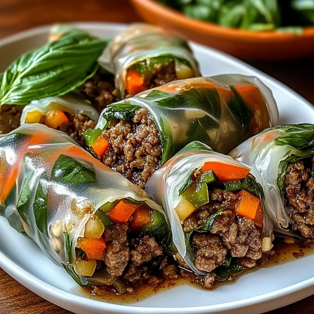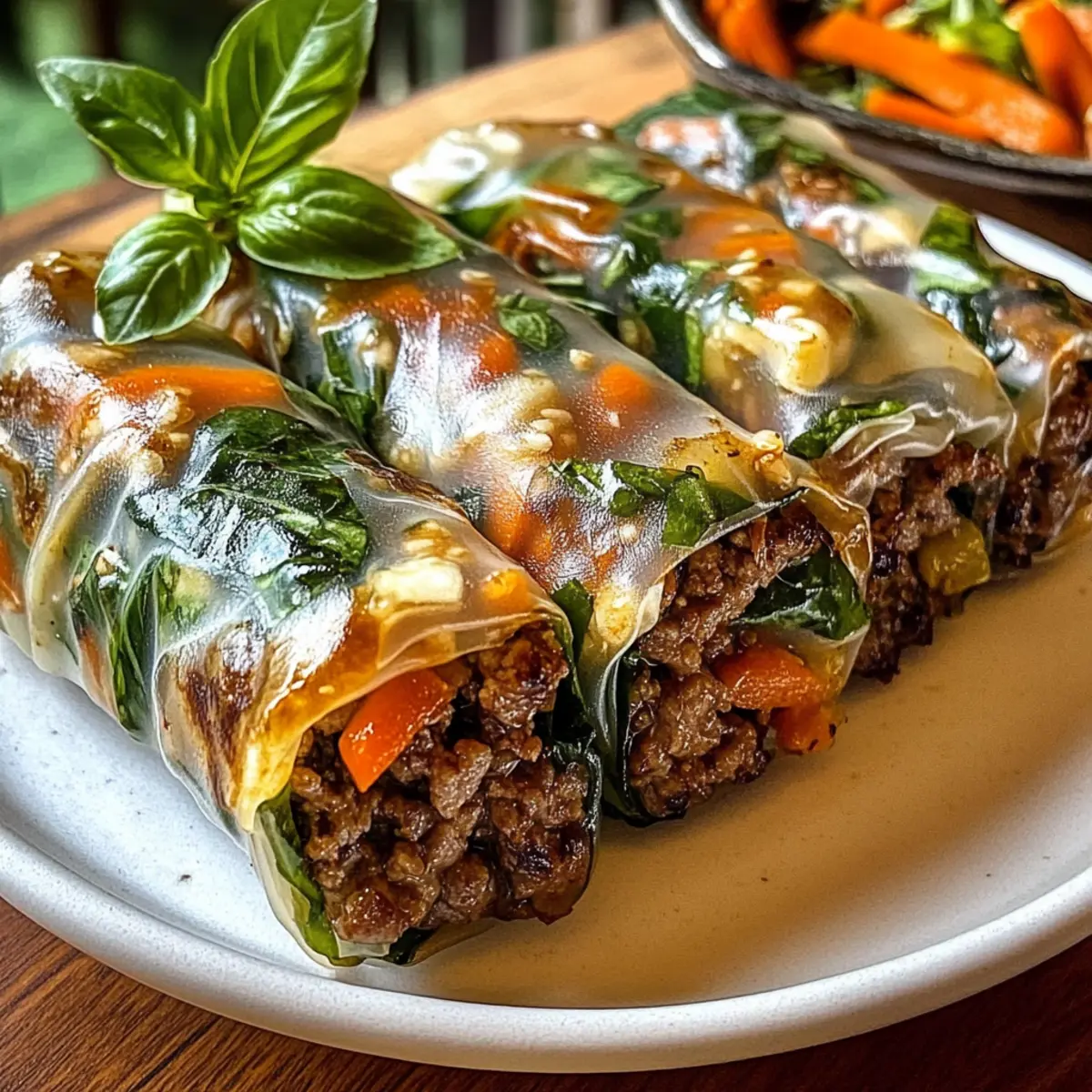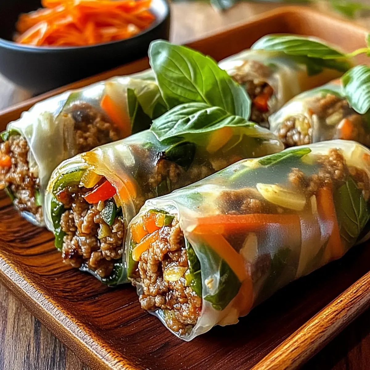 Als ich kürzlich in einem kleinen thailändischen Restaurant saß, wurde mir klar, dass es nichts Besseres gibt als die frisch zubereiteten Thai-Basilikum-Rindfleisch-Rollen. Diese köstlichen, gesunden Wraps sind nicht nur schnell zubereitet, sondern auch eine wahre Gaumenfreude, die jeden glücklich macht – ganz gleich, ob du einen Snack für das nächste Mittagessen oder eine bunte Platte für deine nächste Feier brauchst. Mit zartem, gewürztem Rindfleisch, knackigem Gemüse und dem aromatischen Duft von frischem Basilikum sind diese Rollen ein Fest für die Sinne. Und das Beste daran? Du kannst sie nach Belieben anpassen, zum Beispiel mit Garnelen oder Hühnchen, um deine eigenen perfekten Rolls zu kreieren. Was hältst du davon, diese frischen, gesunden Leckerbissen selbst zu zaubern? Warum sind diese Rolls so besonders? Frische Aromen: Die Kombination aus saftigem Rindfleisch und aromatischem Basilikum sorgt für einen Geschmack, der begeistert. Schnell zubereitet: In weniger als 30 Minuten kannst du diese köstlichen Rollen herstellen, ideal für hektische Tage. Gesund und nahrhaft: Mit frischem Gemüse und magerem Fleisch sind sie eine großartige, nährstoffreiche Wahl. Vielseitig anpassbar: Ob mit Garnelen oder Hühnchen, du kannst die Füllung nach deinem Geschmack variieren. Perfekt für jede Gelegenheit: Ob als Snack oder auf einer Partyplatte – sie kommen immer gut an! Für noch mehr Ideen, wie du deine Kreativität in der Küche ausleben kannst, schau dir unsere Kirschen Schokoladen Brownies oder Schokoladenmousse Brownies Rezept an. Thai-Basilikum-Rindfleisch-Rollen Zutaten Für die Füllung: Mageres Rinderhackfleisch – bietet eine reichhaltige Proteinbasis und hält die Aromen gut. Substitution: Garnelen können für eine leckere Meeresfrüchte-Variante verwendet werden. Sojasauce – verleiht der Füllung einen salzigen, umami Kick. Hoisinsauce – balanciert die Salzigkeit mit einer subtilen Süße. Geriebene Karotten – sorgen für einen knusprigen Biss und lebendige Farbe. Geschnittene Paprika – bringt Frische und natürliche Süße. Frische Basilikumblätter – das wichtigste Kraut, das den Rollen den charakteristischen aromatischen Geschmack verleiht. Für die Verpackung: Reispapier-Wrapper – weich, dünn und perfekt zum Einwickeln frischer Rollen. Genieße die Zubereitung dieser Thai-Basilikum-Rindfleisch-Rollen und lass deiner Kreativität freien Lauf! Schritt-für-Schritt-Anleitungen für Thai-Basilikum-Rindfleisch-Rollen Schritt 1: Rindfleisch braten Erhitze eine große Pfanne bei mittlerer Hitze und gib das mageres Rinderhackfleisch hinein. Brate es unter ständigem Rühren für etwa 5-7 Minuten an, bis es vollständig gebräunt ist. Füge die Sojasauce und die Hoisinsauce hinzu, um den Aromen Tiefe zu verleihen. Rühre alles gut um, sodass das Fleisch gleichmäßig gewürzt wird. Schritt 2: Gemüse hinzufügen Gib die geriebenen Karotten und die geschnittenen Paprika in die Pfanne mit dem Rindfleisch. Koche die Mischung für etwa 2-3 Minuten weiter, bis das Gemüse leicht weich, aber knackig bleibt. Achte darauf, das Gemüse nicht zu lange zu kochen, um die frischen Aromen und die Farbe zu bewahren, während du die Füllung für die Thai-Basilikum-Rindfleisch-Rollen zubereitest. Schritt 3: Reispapier vorbereiten Fülle eine flache Schüssel mit warmem Wasser und tauche ein Reispapierblatt ein, bis es bemerkenswert weich und flexibel wird (etwa 10 Sekunden). Lege das Blatt dann vorsichtig auf ein sauberes Küchenbrett oder eine Arbeitsfläche, um mit dem Füllen und Rollen zu beginnen. Stelle sicher, dass das Papier nicht zu lange im Wasser bleibt, sonst kann es zerreißen. Schritt 4: Füllen der Rollen Platziere eine Handvoll frischer Basilikumblätter und eine großzügige Portion der Rindfleisch-Gemüse-Mischung in der Mitte des Reispapierblatts. Achte darauf, dass du nicht zu viel Füllung verwendest, um ein einfaches Rollen zu gewährleisten. Die frischen Aromen der Basilikumblätter werden sich harmonisch mit dem Rindfleisch verbinden und die Thai-Basilikum-Rindfleisch-Rollen verfeinern. Schritt 5: Rollen und verschließen Beginne, das Reispapier von unten über die Füllung zu rollen, während du die Seiten leicht einrollst, um die Füllung zu versiegeln. Rolle die Reisblätter fest, um sicherzustellen, dass die Füllung sicher eingeschlossen ist. Achte darauf, gleichmäßigen Druck auszuüben, damit die Rollen gut zusammenhalten und appetitlich aussehen. Schritt 6: Servieren Die Thai-Basilikum-Rindfleisch-Rollen sollten sofort serviert werden, um die beste Textur und Frische zu genießen. Platziere die Rollen auf einem schönen Teller und serviere sie mit deinen bevorzugten Dipsaucen wie Erdnusssauce oder süßer Chilisauce. Die Kombination von frischen Zutaten und aromatischen Aromen wird sicher jeden beeindrucken! Was passt zu Thai-Basilikum-Rindfleisch-Rollen? Genieße die Thai-Basilikum-Rindfleisch-Rollen als Teil eines festlichen Essens oder einer entspannten Zusammenkunft. Die harmonische Mischung aus frischen Aromen und Texturen ist eine wahre Freude für die Sinne. Cremige Erdnusssauce: Diese süßlich-salzige Sauce verstärkt die Aromen und sorgt für einen herzhaften Genuss beim Dippen. Scharfe Chili-Sauce: Die Würze der Chili-Sauce bietet einen aufregenden Kontrast zu den milden Rollen und erhöht den Geschmacksgrad. Frischer Gurkensalat: Leicht und knackig, bringt der Gurkensalat eine erfrischende Note, die die wärmenden Aromen der Rindfleischrollen wunderbar ergänzt. Ein guter Biss zur Balance! Soja-Limetten-Dressing: Dieses Dressing sorgt für eine spritzige Frische, die nicht nur die Rollen toll abrundet, sondern auch als Salatbeilage funktioniert. Mango-Salsa: Die Süße und Frische der Mango schaffen eine perfekte Harmonie mit den würzigen Aromen der Rollen und sorgen für ein festliches Erlebnis. Limonade mit Minze: Ein erfrischendes Getränk, das die Geschmacksknospen belebt und die Aromen auflockert – ideal für