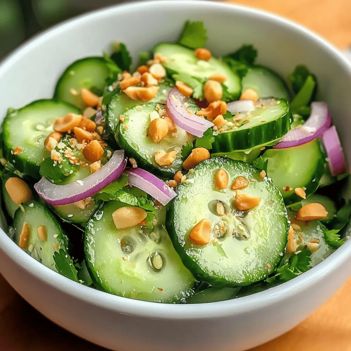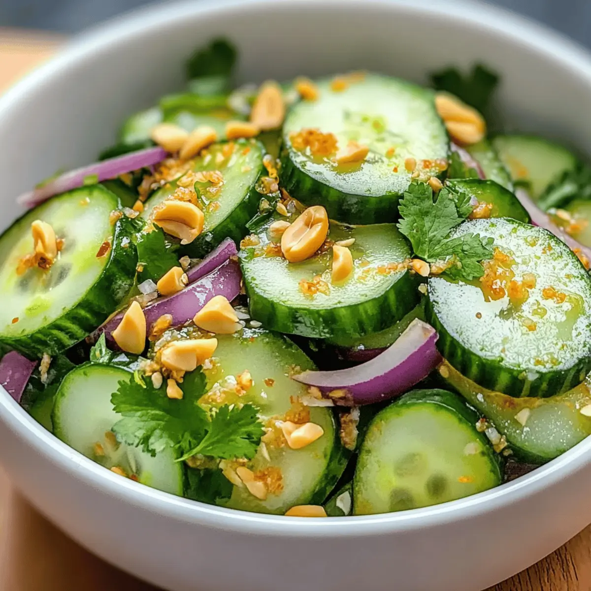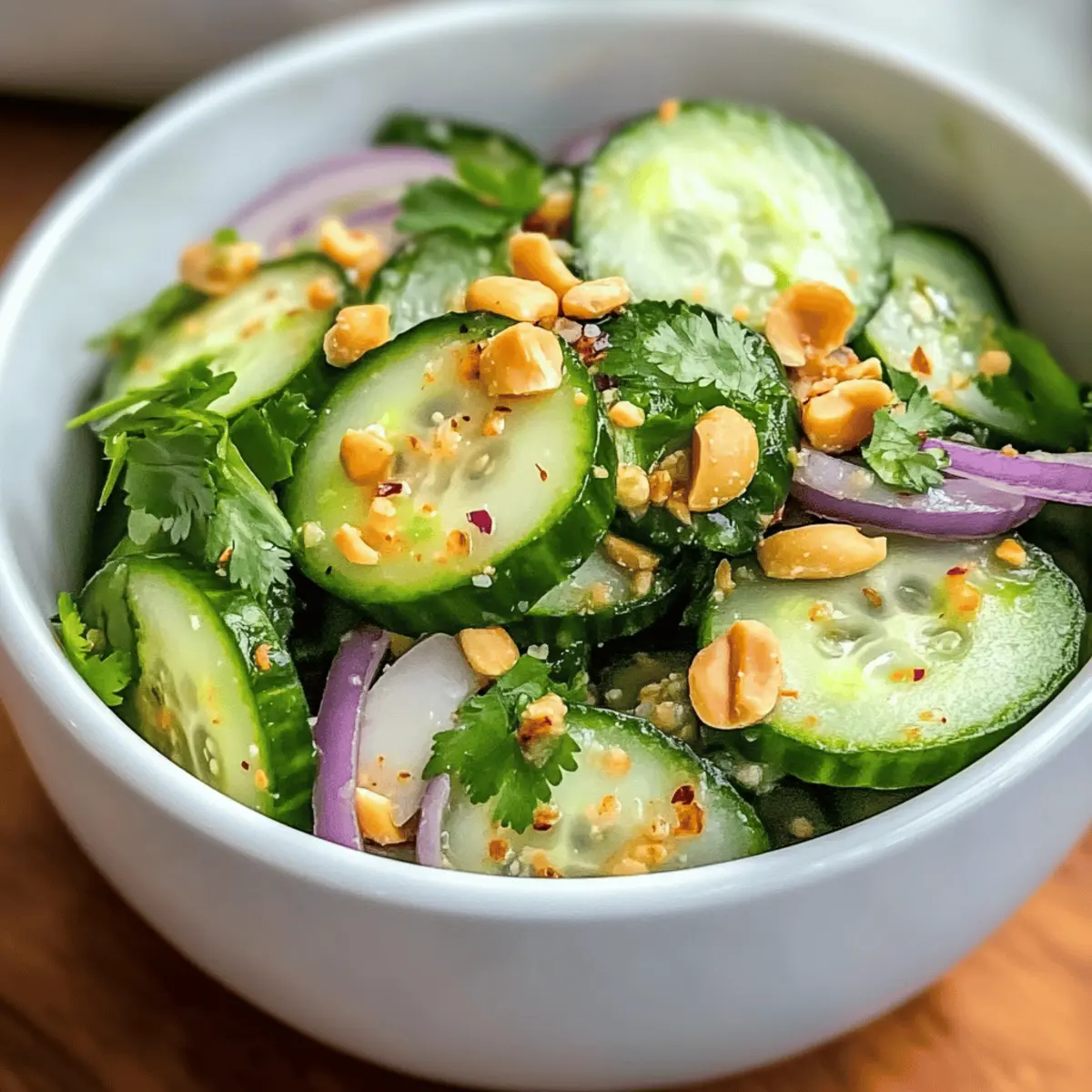 Der Sommer steht vor der Tür und ich kann kaum anders, als an die erfrischenden Aromen und knackigen Texturen zu denken, die uns diese Jahreszeit bietet. Wenn ich an ein Gericht denke, das perfekt zu heißen Tagen passt, fällt mir sofort der Thai Gurkensalat mit crunchy Erdnüssen ein. Welche Kombination aus süßem und würzigem Dressing könnte besser sein, um meine Geschmacksknospen zu beleben? Dieser schnelle und unkomplizierte Salat ist nicht nur ein kalorienarmes Highlight, sondern auch eine wunderschöne Beilage, die jede Grillparty oder asiatische Mahlzeit ergänzt. Die knackigen, frischen Zutaten ziehen mich immer wieder in ihren Bann. Bist du bereit, diesen köstlichen Salat selbst zuzubereiten? Warum wirst du diesen Rezept lieben? Einfachheit: Die Zubereitung ist kinderleicht und erfordert nur grundlegende Kochfähigkeiten, perfekte für Anfänger und erfahrene Köche gleichermaßen. Erfrischende Aromen: Mit dem süß-sauren Dressing und dem knackigen Gemüse wird dieser Salat deine Geschmacksknospen erfreuen. Vielseitigkeit: Ob als Beilage zum Thai Sloppy Joe oder als leichter Snack, dieser Salat passt zu vielen Gerichten. Gesund und Kalorienarm: Ideal für eine gesunde Ernährung, ganz ohne Verzicht. Vorbereitung: Der Salat kann im Voraus zubereitet werden, sodass du mehr Zeit mit deinen Gästen verbringen kannst. Probier es aus und lass dich von der Frische begeistern! Thai Gurkensalat Zutaten Note: Alle Zutaten zusammen ergeben einen erfrischenden Thai Gurkensalat, der perfekt für warme Tage geeignet ist. Für den Salat Persische Gurken – Diese sorgen für Frische und Knackigkeit; alternativ kannst du auch englische oder Garten-Gurken verwenden, dabei jedoch die Kerne entfernen, um die Wässrigkeit zu reduzieren. Salz – Es zieht die Feuchtigkeit aus den Gurken und verhindert, dass der Salat matschig wird. Rundreisessig – Verleiht dem Dressing eine pikante Note, die ideal mit den Gurken harmoniert. Zucker – Balanciert die Säure des Essigs und sorgt für eine süß-säuere Sauce. Rote Zwiebel – Bietet einen scharfen Kontrast zu den erfrischenden Gurken; du kannst auch Schalotten oder Frühlingszwiebeln verwenden. Frischer Koriander – Erhöht den Geschmack; optional, je nach persönlicher Vorliebe. Gehackte Erdnüsse – Fügen eine knackige Textur hinzu; am besten kurz vor dem Servieren dazugeben, um die Frische zu bewahren. Schritt-für-Schritt-Anleitung für Erfrischenden Thai Gurkensalat mit Crunchy Erdnüssen Schritt 1: Gurken vorbereiten Schneide die persischen Gurken dünn und gib sie in ein Sieb. Streue etwas Salz darüber und tossiere die Gurken gut, sodass sie gleichmäßig bedeckt sind. Lasse die Gurken dann für etwa 10 Minuten stehen, damit das Salz die Feuchtigkeit entzieht und die Gurken knackig bleiben. Schritt 2: Feuchtigkeit entfernen Nehme ein Küchenpapier zur Hand und tupfe die Gurken vorsichtig ab, um überschüssige Feuchtigkeit zu entfernen. Dieser Schritt ist wichtig, um sicherzustellen, dass dein Thai Gurkensalat nicht matschig wird. Die Gurken sollten weiterhin frisch und knusprig aussehen. Schritt 3: Dressing zubereiten In einer kleinen Schüssel kombiniere den Rundreisessig und den Zucker. Stelle die Mischung für 30 Sekunden in die Mikrowelle und rühre, bis der Zucker vollständig aufgelöst ist. Das Dressing sollte eine klare, leicht sirupartige Konsistenz haben und bereit sein, den Salat zu verfeinern. Schritt 4: Zutaten mischen Gib die vorbereiteten Gurken in eine große Schüssel und füge die dünn geschnittene rote Zwiebel sowie die Essigmischung hinzu. Mische alles gut, sodass die Gurken gleichmäßig mit dem Dressing bedeckt sind. Füge nach Belieben frischen Koriander hinzu, um dem Erfrischenden Thai Gurkensalat zusätzlichen Geschmack zu verleihen. Schritt 5: Marinieren lassen Bedecke die Schüssel mit Frischhaltefolie und stelle den Salat für mindestens 20 Minuten in den Kühlschrank. Je länger du ihn ziehen lässt, desto intensiver entwickeln sich die Aromen. Um den vollen Geschmack zu genießen, kannst du den Salat bis zu 24 Stunden im Voraus zubereiten. Schritt 6: Erdnüsse hinzufügen Kurz vor dem Servieren streue die gehackten Erdnüsse über den Thai Gurkensalat. Dies sorgt für den gewünschten Crunch und bleibt knusprig. Serviere den Salat sofort, um die Frische der Zutaten und die knusprige Textur optimal zu genießen. Was passt gut zu erfrischendem Thai Gurkensalat? Genieße eine harmonische Zusammenstellung, die deinen Thai Gurkensalat perfekt ergänzt und die Sinne verführt. Gegrilltes Hähnchen-Satay: Zartes Hähnchenfleisch, mariniert in einer würzigen Erdnusssoße, harmoniert perfekt mit der Frische des Salats. Diese Kombination erzeugt ein Geschmackserlebnis, das du lieben wirst. Reisnudeln: Eine weiche, aber dennoch strukturierte Beilage, die die Aromen des Salates sanft aufnimmt und fleischige Hauptgerichte hervorragend ergänzt. Pad Thai: Die süßlich-säuerlichen Aromen des Pad Thai bieten einen bezaubernden Kontrast zur knackigen Frische des Gurkensalats. Zusammen schaffen sie eine ausgewogene Mahlzeit. Spicy Curry: Die Schärfe eines würzigen Currys wird durch die erfrischende Kühle des Gurkensalats gemildert und sorgt für ein beeindruckendes Geschmacksduett. Frisches Baguette: Knuspriges Baguette serviert mit einem Hauch von Butter ist ein hervorragendes Begleitspiel zu jedem asiatischen Gericht und ist ideal, um die restlichen Saucen aufzunehmen. Mangodessert: Ein leichtes Mangodessert mit Kokosmilch rundet das Essen ab und hinterlässt einen süßen, exotischen Nachgeschmack, der perfekt harmoniert. Variationen & Alternativen für Thai Gurkensalat Lass deiner Kreativität freien Lauf und passe dieses Rezept nach deinem Geschmack an! Nussfrei: Ersetze die Erdnüsse durch Sonnenblumenkerne, um eine ähnliche knusprige Textur zu erhalten, ohne Nüsse zu verwenden. Diese Option ist auch perfekt für Allergiker geeignet. Würzig: Füge frische Chili- oder rote Paprikaflocken hinzu, um deinem