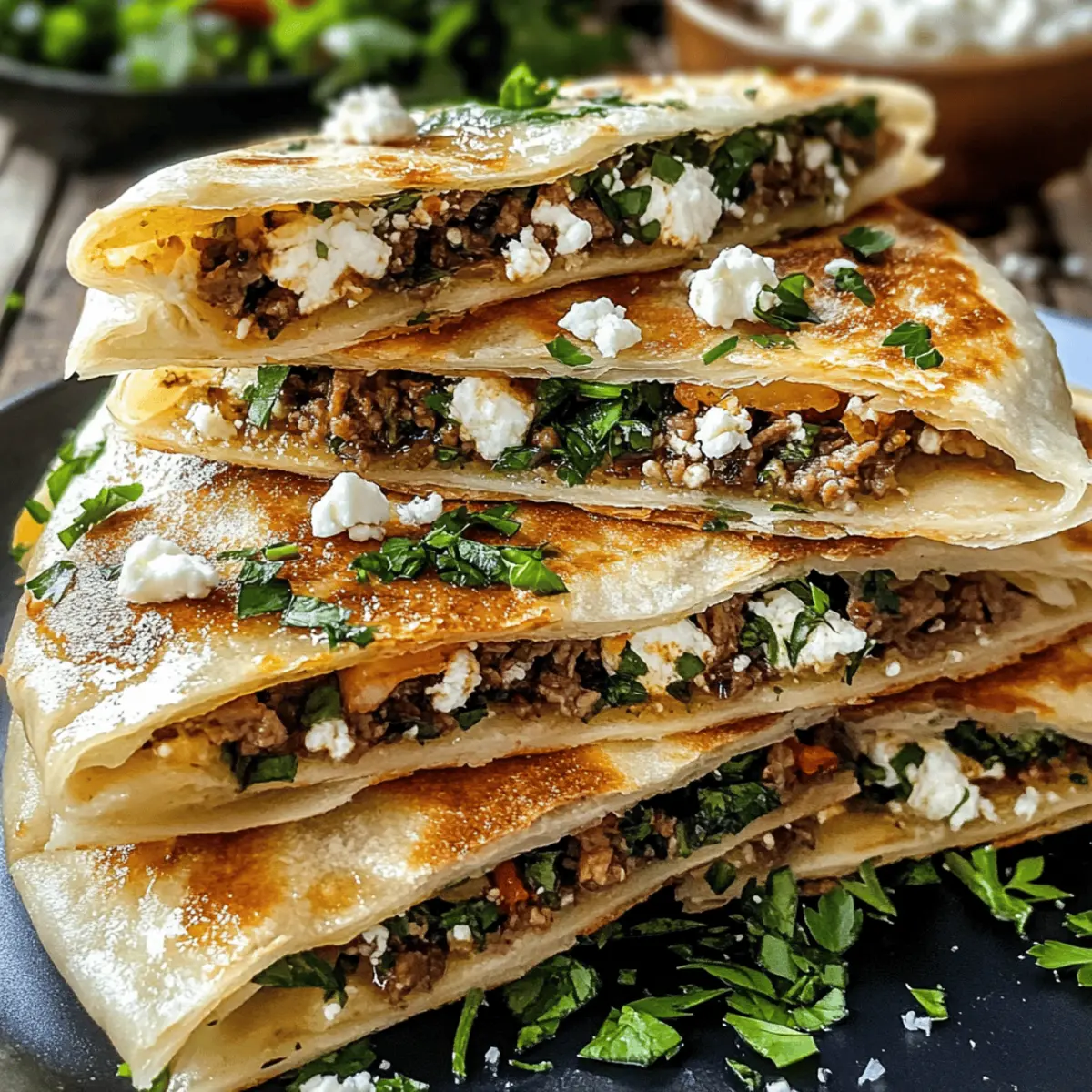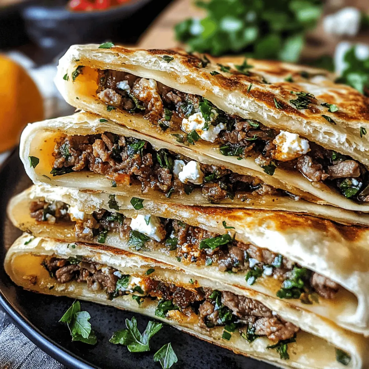 Während ich diesen köstlichen Duft in meiner Küche wahrnehme, werde ich sofort in die lebhaften Gassen der türkischen Märkte zurückversetzt. Dort wird die Kunst des Gozleme, eines traditionellen gefüllten Fladenbrots, mit Leidenschaft und Geschick zelebriert. In meinem Rezept für Türkische Gozleme mit gewürzt aromatischem Lamm und Feta zeige ich dir, wie du diese knusprigen, buttrigen Schätze ganz einfach selbst zubereiten kannst. Diese Gozleme sind nicht nur ein echter Genuss für die Seele, sondern auch ein schnelles, hausgemachtes Lieblingsgericht, das sich perfekt für entspannte Abendessen oder gesellige Anlässe eignet. Möchtest du die Geheimnisse hinter dieser köstlichen Füllung und der perfekten Teigkonsistenz enthüllen? Lass uns gemeinsam ins Kochen eintauchen! Warum wirst du dieses Rezept lieben? Einfachheit: Die Zubereitung dieser Gozleme erfordert nur grundlegende Kochkünste, wodurch sie ideal für alle sind, die frische, hausgemachte Mahlzeiten schätzen. Herzhafter Geschmack: Die Kombination aus würzigem Lammfleisch, frischen Kräutern und cremigem Feta sorgt für ein unvergleichlich reichhaltiges Aroma, das deinen Gaumen verwöhnt. V Vielseitigkeit: Du kannst das Rezept einfach anpassen, indem du zum Beispiel das Lamm durch Hühnchen oder eine vegetarische Füllung ersetzt. So bleibt es immer spannend! Geselliges Kochen: Perfekt für gemeinsames Kochen mit Freunden oder der Familie, werden diese Gozleme garantiert alle begeistern und in Erinnerungen schwelgen lassen. Wenn du nach weiteren herzhaften Gerichten suchst, schau dir auch unser Rezept für Wuerziges Rinderfleisch Mit an oder entdecke die Köstlichkeiten unseres Herzhafter Italienischer Rinderbraten. Köstliche Gozleme Zutaten • Diese Köstliche Gozleme sind nur der Anfang deines kulinarischen Abenteuers! Für den Teig: Allzweckmehl – sorgt für die perfekte Textur des Teigs. Zur Herstellung einer gesünderen Variante kann Vollkornmehl verwendet werden. Salz – hebt den Geschmack hervor. Kostprobe anpassen, um das perfekte Verhältnis für deinen Gaumen zu finden. Griechischer Joghurt (natur) – verleiht dem Teig Feuchtigkeit und einen leichten säuerlichen Geschmack. Falls nicht verfügbar, kann auch saure Sahne genutzt werden. Wasser – hydratisiert den Teig. Zimmertemperatur ist ideal für die besten Ergebnisse. Olivenöl – sorgt für zusätzlichen Geschmack und Feuchtigkeit im Teig. Jedes Speiseöl kann als Alternative verwendet werden. Für die Füllung: Zwiebel (gehackt) – fügt Süße und Tiefe hinzu. Schalotten können ebenfalls verwendet werden, für eine sanftere Note. Knoblauch (gehackt) – liefert aromatischen Geschmack. Frischer Knoblauch ist am besten; er kann durch Knoblauchpulver ersetzt werden, wenn nötig. Gemahlenes Lamm – die Hauptzutat, voller Geschmack und Saftigkeit. Für eine Abwechslung können auch gemahlenes Rind- oder Hühnerfleisch verwendet werden. Tomatenmark – bringt das gewisse Etwas in die Füllung. Frische Tomaten können ebenfalls verwendet werden, aber der Feuchtigkeitsgehalt verändert sich. Koriander (gemahlen) – verleiht ein warmes Aroma. Du kannst stattdessen Kreuzkümmel verwenden, falls du eine andere Geschmacksnote bevorzugst. Räucherpaprika – fügt eine rauchige Note hinzu. Wenn das nicht vorhanden ist, funktioniert auch normale Paprika, verliert aber die rauchige Frische. Kreuzkümmel (gemahlen) – bringt eine herzliche Komplexität mit sich. Garam Masala kann für eine kreative Wendung benutzt werden. Spinat (gefroren, aufgetaut und gehackt) – fügt Nährstoffe und Feuchtigkeit hinzu. Frischer Spinat kann auch verwendet werden, benötigt aber kürzere Kochzeit. Minze (gehackt) – bringt einen frischen und leichten Geschmack in die Füllung. Trockenminze ist eine Alternative, jedoch in geringeren Mengen. Frühlingszwiebeln (gehackt) – gibt eine milde Zwiebelnote. Eingehäuft kann man auch normale Zwiebeln nutzen, erfordert aber längeres Kochen. Petersilie (gehackt) – für Frische und Farbe. Jede andere frische Kräuter, die du magst, ist ebenfalls geeignet. Feta-Käse (zerkrümelt) – sorgt für Cremigkeit und salzige Nuancen. Ricotta kann als milderer Ersatz verwendet werden. Tomaten (gehackt) – bringt Saftigkeit in die Füllung. Alternativ können auch Paprika für mehr Crunch Verwendung finden. Zitronenschnitze – werden zum Servieren hinzugefügt und bringen Frische in das Gericht. Ein anderer Zitrus, wie Limette, kann ebenfalls eine interessante Geschmacksnote hinzufügen. Mit diesen köstlichen Gozleme Zutaten bist du bereit, in eine aufregende Kochreise einzutauchen! Schritt-für-Schritt-Anleitung für Türkische Gozleme mit gewürztem Lamm & Feta Step 1: Teigzubereitung In einer großen Schüssel Allzweckmehl und Salz vermengen. Füge griechischen Joghurt und Wasser hinzu und rühre, bis ein grober Teig entsteht. Knete den Teig für etwa 3 Minuten auf einer bemehlten Fläche, bis er glatt und elastisch ist. Decke den Teig mit einem feuchten Tuch ab und lasse ihn 30 Minuten ruhen, damit er entspannen kann. Step 2: Füllungszubereitung Erhitze in einer Pfanne bei mittlerer Hitze etwas Olivenöl. Füge die gehackte Zwiebel und den Knoblauch hinzu und brate sie an, bis sie weich und goldbraun sind. Gib das gemahlene Lammfleisch dazu und brate es an, bis es komplett durchgegart und leicht gebräunt ist. Rühre dann Tomatenmark, Koriander, geräucherte Paprika, Kreuzkümmel, Salz und Pfeffer ein, gefolgt von dem gehackten Spinat. Lasse die Füllung kurz abkühlen. Step 3: Gozleme formen Teile den ruhenden Teig in vier gleich große Stücke. Rolle jedes Stück auf einer bemehlten Fläche zu einem dünnen Rechteck von etwa 30×25 cm aus. Platziere die Füllung in der Mitte jedes Rechtecks und füge die gehackten Kräuter, Feta und Tomaten hinzu. Klappe die Seiten über die Füllung und drücke die Ränder gut zusammen, um sie zu versiegeln. Step 4: Gozleme kochen Erhitze eine beschichtete Pfanne bei mittlerer Hitze und