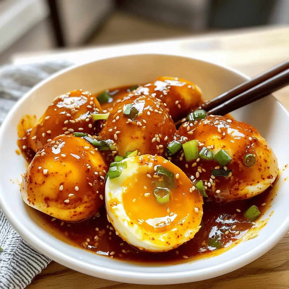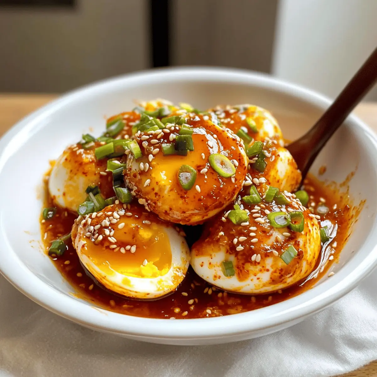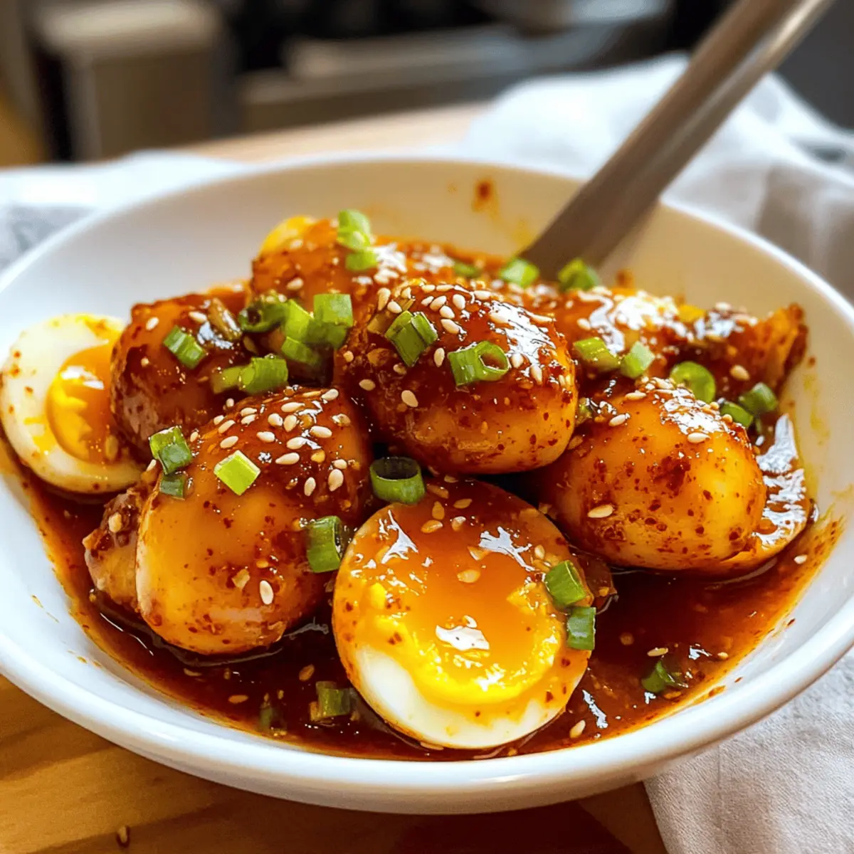 Während ich die köstlichen Aromen der koreanischen Küche entdecke, haben sich die Spicy Gochujang Eggs zu meinen Lieblingsbegleitgerichten entwickelt. Diese Eier sind nicht nur in kürzester Zeit zubereitet, sondern bringen auch einen unwiderstehlichen umami Kick mit sich, der deinen Gaumen verwöhnt. Sie werden perfekt auf den Punkt gekocht und harmonieren ideal mit einer Schale Reis. Die süßlich-scharfe Sauce sorgt für eine gemütliche Wärme, die das Gericht noch weiter aufwertet. Wenn du auf der Suche nach einer schnellen, köstlichen Alternative zu Fast Food bist, dann sind diese Gochujang Eier genau das Richtige für dich. Möchtest du wissen, wie einfach es ist, dieses schlichte, aber befriedigende Gericht zuzubereiten? Warum wirst du dieses Rezept lieben? Einfachheit: Die Zubereitung ist schnell und unkompliziert, perfekt für die stressigen Wochentage. Umami-Geschmack: Die Kombination von Gochujang und Sojasauce sorgt für eine unverwechselbare, würzige Tiefe. Vielfalt: Diese Eier sind vielseitig – ob als Beilage oder Hauptgericht, du kannst sie nach Belieben variieren. Schnelles Kochen: In nur 15 Minuten hast du ein köstliches Gericht, das jedem schmeckt. Und wenn du etwas mehr Abwechslung möchtest, kannst du auch Gemüse hinzufügen oder die Eier über Quinoa oder Nudeln servieren. Beliebtheit: Ideal für Familien und Freunde – jeder wird von diesem Gericht begeistert sein! Zutaten für Würzige Gochujang Eier Für die Eier • Eier – für optimale Ergebnisse verwende große Eier, sie liefern die beste Proteinstruktur. Für die Sauce • Gochujang – fügt einen scharfen Umami-Geschmack hinzu; alternativ kannst du mit Chili-Paste arbeiten. • Sojasauce – verstärkt die herzhaften Noten; für eine glutenfreie Option kann Tamari verwendet werden. • Zucker – sorgt für eine ausgewogene Süße; verwende braunen Zucker für mehr Tiefe. • Reisessig – bringt Frische und Säure; weißer Essig kann als Ersatz dienen. • Hühnerbrühe (oder Wasser) – verleiht der Sauce Substanz; Gemüsebrühe ist eine vegetarische Alternative. • Neutrales Öl – zum Sautieren von Knoblauch; Olivenöl ist eine geschmackvolle Alternative. Für die Garnitur • Knoblauch (gehackt) – fügt eine aromatische Note hinzu; frischer Knoblauch bringt mehr Geschmack als Knoblauchpulver. • Frühlingszwiebel (in Scheiben) – für Frische und als Garnitur; kann durch gehackte grüne Zwiebeln ersetzt werden. • Geröstete Sesamsamen – sorgen für einen knusprigen, nussigen Geschmack; können weggelassen werden, wenn sie nicht verfügbar sind. Step-by-Step Instructions for Würzige Gochujang Eier Step 1: Eier kochen Bringe in einem kleinen Topf Wasser zum Kochen. Sobald das Wasser kocht, lasse vorsichtig 8 große Eier hinein. Decke den Topf ab und koche die Eier genau 7 Minuten lang, um eine perfekte, cremige Konsistenz zu erhalten. Step 2: Eisbad Übertrage die gekochten Eier sofort in ein Eisbad, um den Garprozess zu stoppen. Lasse sie einige Minuten abkühlen, bis sie handwarm sind, und schäle die Eier anschließend vorsichtig, um die zarte Struktur nicht zu beschädigen. Step 3: Sauce vorbereiten In einer Schüssel mischst du Gochujang, Sojasauce, Zucker, Reisessig und Hühnerbrühe gut miteinander. Achte darauf, dass sich der Zucker vollständig auflöst, während du die Zutaten verrührst, um eine gleichmäßige Sauce für die würzigen Gochujang Eier zu erhalten. Step 4: Knoblauch anbraten Erhitze in einer Pfanne bei mittelhoher Temperatur etwas neutrales Öl. Füge den gehackten frischen Knoblauch hinzu und brate ihn etwa 15 Sekunden lang an, bis er duftet. Achte darauf, dass der Knoblauch nicht anbrennt, um Bitterkeit zu vermeiden. Step 5: Sauce köcheln lassen Gib die vorbereitete Gochujang-Sauce in die Pfanne mit dem angebratenen Knoblauch. Bringe die Mischung unter leichtem Rühren zum Köcheln, damit sich die Aromen entfalten und die Sauce leicht eindickt. Step 6: Eier und Sauce kombinieren Platziere die geschälten Eier in der köchelnden Sauce und koche sie weitere 3 Minuten lang. Während dieser Zeit kannst du die Eier vorsichtig wenden, damit sie gleichmäßig mit der Sauce bedeckt werden und die würzigen Aromen aufnehmen. Step 7: Servieren Serviere die würzigen Gochujang Eier über einer Schale Reis. Garniere das Gericht mit in Scheiben geschnittenen Frühlingszwiebeln und einem Hauch gerösteter Sesamsamen für zusätzlichen Crunch und Geschmack. Tipps für die besten Würzigen Gochujang Eier Kochzeit anpassen: Wenn du die Eier weicher oder härter magst, koche sie 6 Minuten für ein flüssigeres Eigelb oder bis zu 9 Minuten für hartgekochte Eier. Wasser reicht nicht: Achte darauf, dass das Wasser die Eier vollständig bedeckt. So werden sie gleichmäßig gegart und erhalten die perfekte Konsistenz. Schnelles Eisbad: Verwende ein Eisbad direkt nach dem Kochen, um den Garprozess zu stoppen. Das erleichtert das spätere Schälen der Eier. Qualität der Zutaten: Setze auf frischen Knoblauch und hochwertige Gochujang für den besten umami Geschmack. Vermeide fertige Mischungen, um die Aromen zu intensivieren. Variationen & Alternativen Lass deiner Kreativität freien Lauf und passe das Rezept ganz nach deinem Geschmack an! Dairy-Free: Ersetze die Hühnerbrühe durch pflanzliche Brühe für eine milchfreie Variante. Scharfer Kick: Füge frische Chilis oder Chili-Flakes in die Sauce hinzu, um die Schärfe noch zu steigern. Gemüse hinzufügen: Integriere sautiertes Gemüse wie Paprika oder Spinat in die Sauce – das sorgt für zusätzlichen Nährwert und Farbe. Nussige Note: Streue gehackte Erdnüsse über die Eier, um eine knackige Textur und einen nussigen Geschmack zu erhalten. Alternative Süßstoffe: Verwende Honig oder Agavendicksaft für eine natürliche Süße, ideal für Menschen, die auf Zucker verzichten möchten. Würzige Marinade: Lasse die gekochten Eier in der Sauce für mehrere Stunden ziehen, so nehmen sie ein intensiveres Aroma an. Säuerlicher