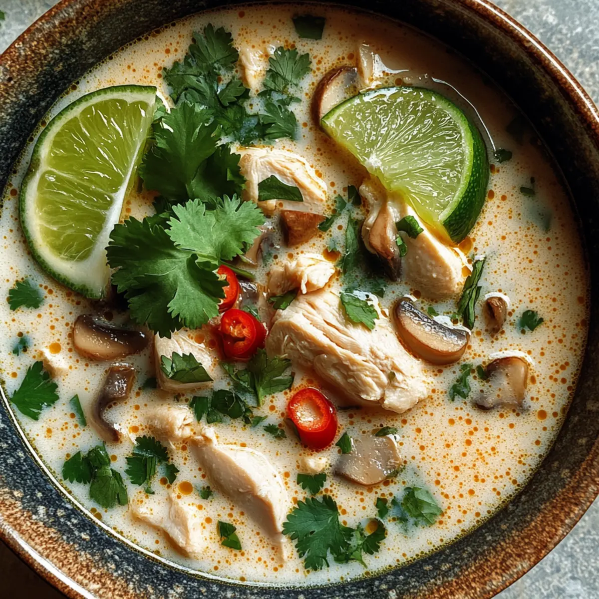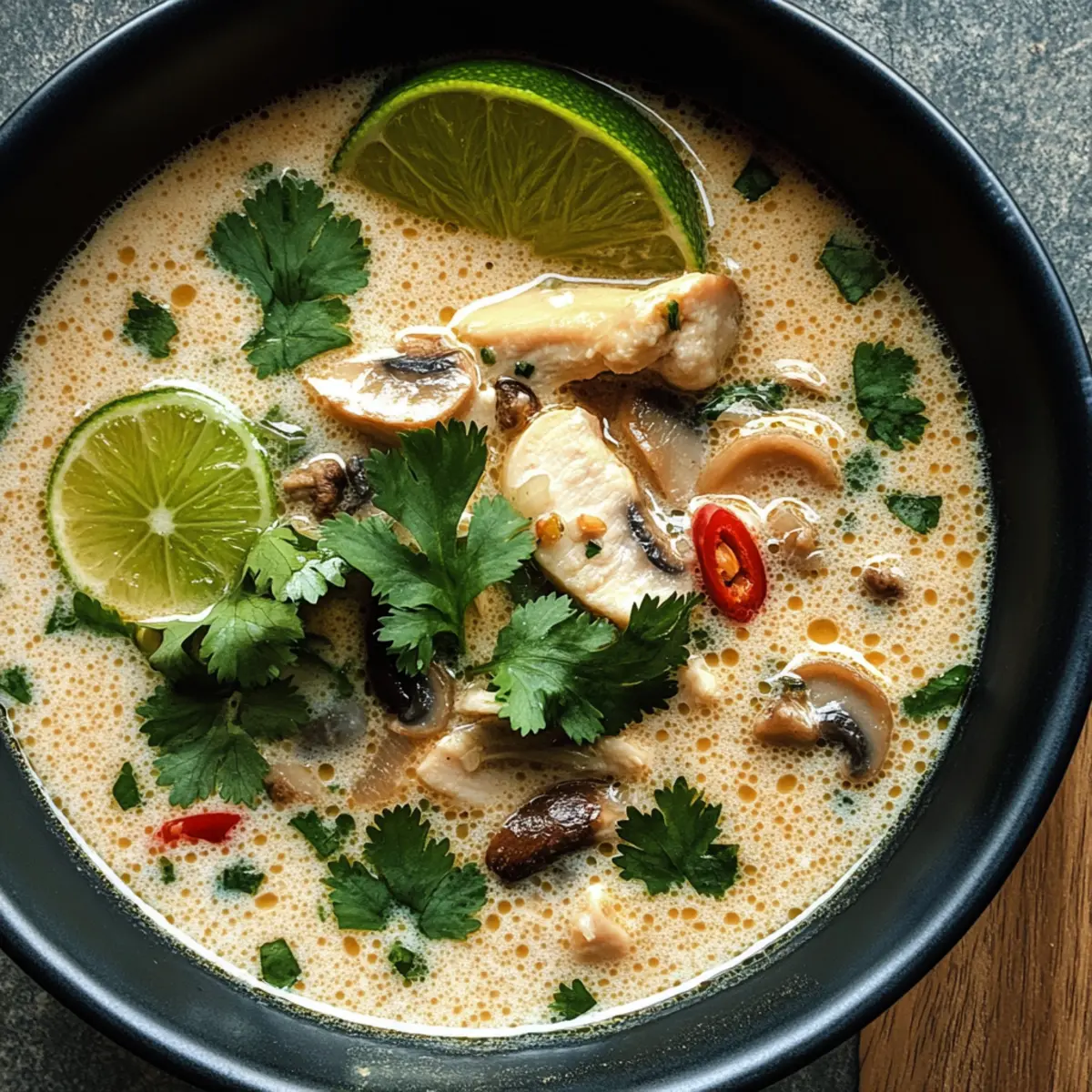 Die erste Löffel dieser Würzigen Tom Kha wird dir sofort die warme Umarmung eines tropischen Urlaubs bieten. Die Kombination aus cremiger Kokosmilch, spritzigem Limettensaft und einer angenehmen Schärfe zaubert nicht nur ein Gefühl von Gemütlichkeit, sondern ist auch unglaublich anpassungsfähig – ideal für jeden Essensplan. Diese Suppe ist nicht nur schnell zubereitet, sondern auch perfekt für einen hektischen Wochentag oder gemütliche Abende zu Hause. Als besonderes Extra kannst du die Zutaten je nach Vorliebe oder diätetischen Bedürfnissen variieren. Neugierig, welche köstlichen Möglichkeiten sich dir bieten? Warum solltest du diese Suppe lieben? Köstlicher Genuss: Die Würzige Tom Kha vereint eine perfekte Balance von cremiger Kokosmilch und einem Spritzer spritziger Limette, der jeden Löffel zu einem Geschmackserlebnis macht. Schnell und einfach: In nur wenigen Minuten kannst du dein eigenes asiatisches Festmahl genießen, ideal für geschäftige Abende. Vielseitige Alternativen: Ob mit Hühnchen, Tofu oder Garnelen, die Möglichkeiten sind schier endlos! Du kannst diese Suppe ganz einfach an deine diätetischen Vorlieben anpassen. Comfort Food pur: Sie bringt die Wärme und Gemütlichkeit eines tropischen Urlaubs direkt in deine Küche. Perfekt nach einem langen Tag! Möchtest du mehr inspirierende Rezepte? Probiere auch unsere schnellen Rezeptideen für weitere köstliche Optionen! Würzige Tom Kha Zutaten Für die Brühe Kokosmilch – sorgt für Cremigkeit; verwende leichte Kokosmilch für eine kalorienärmere Version. Hühnchen (oder Tofu/Garnelen) – ist die Hauptproteinquelle und macht die Suppe herzhaft; Tofu ist eine tolle vegetarische Option. Galangal – ist unerlässlich für den authentischen Geschmack; hat eine zitrusartige Note; ersetze ihn durch frischen Ingwer, wenn nicht verfügbar. Kaffir-Limettenblätter – verleihen ein blumiges Aroma; kannst auch Limettenschale nutzen, wenn keine Blätter erhältlich sind. Zitronengras – gibt frische, zitrusartige Noten; vor dem Servieren entfernen, da es fest ist. Thailändische Chilischoten – bringen die gewünschte Schärfe; passe die Menge nach deinem Geschmack an oder ersetze sie durch Jalapeños. Fischsauce – sorgt für Umami-Geschmack; in der thailändischen Küche unverzichtbar; für vegetarische Varianten einfach Sojasauce verwenden. Zucker – balanciert die Aromen aus; Honig oder Kokoszucker sind gute Alternativen. Champignons – fügen Textur hinzu und nehmen die Aromen auf; sind optional, aber empfehlenswert. Optionaler Tipp: Diese Würzige Tom Kha lässt sich nach Belieben anpassen, um deiner Vorliebe für Schärfe und Frische gerecht zu werden! Step-by-Step Instructions für Würzige Tom Kha Step 1: Zutaten vorbereiten Beginne damit, das Hühnchen in dünne Scheiben zu schneiden, und schneide die Champignons in Scheiben. Zerkleinere auch die Galangalwurzel und die Kaffir-Limettenblätter. Achte darauf, das Zitronengras grob zu zerdrücken, um die Aromen freizusetzen. Diese Vorbereitungen sind entscheidend für die aromatische Tiefe der Würzigen Tom Kha. Step 2: Brühe köcheln lassen In einem großen Topf erhitzt du bei mittlerer Hitze die Kokosmilch zusammen mit dem geschnittenen Galangal, den Kaffir-Limettenblättern, dem Zitronengras, der Fischsauce und den thailändischen Chilischoten. Lasse die Mischung für etwa 5–10 Minuten sanft köcheln und achte dabei auf ein sanftes Blubbern. Der Duft wird dir schon jetzt den Wasser im Mund zusammenlaufen lassen. Step 3: Hühnchen und Champignons kochen Jetzt fügst du die vorbereiteten Hühnchenscheiben und die Champignons hinzu. Koche alles zusammen für etwa 10 Minuten, bis das Hühnchen durchgegart ist und eine schöne, zarte Konsistenz erreicht hat. Achte darauf, dass die Suppe nicht zu stark kocht, um die Cremigkeit der Kokosmilch zu bewahren. Step 4: Suppe vollenden Nehme den Topf vom Herd und presse den Saft von frischen Limetten hinein, um die Aromen aufzufrischen. Rühre alles gut um und passe die Gewürze nach deinem Geschmack an. Möglicherweise möchtest du einen Hauch mehr Fischsauce oder Zucker hinzufügen, um die perfekte Balance zu erreichen. Step 5: Servieren Lade die Würzige Tom Kha in tiefe Schalen und garniere jede Portion mit frischem Koriander und Limettenspalten. Für ein noch reichhaltigeres Erlebnis kannst du die Suppe mit einer Beilage aus Jasminreis oder Reisnudeln servieren. Genieße diesen warmen, tropischen Genuss sofort! Was passt gut zur Würzigen Tom Kha? Die Kombination aus cremiger Kokosmilch und würzigen Aromen lädt zu einem harmonischen Essen ein, das neben der Suppe noch viele weitere Gaumenfreuden umfasst. Jasminreis: Diese milde Beilage fängt die köstliche Brühe auf und sorgt für eine angenehme Sättigung. Es ist die perfekte Ergänzung. Reisnudeln: Weiche Reisnudeln machen das Gericht noch herzlicher und eleganter. Sie nehmen die Aromen der Suppe wunderbar auf. Frischer Salat: Ein knackiger, grüner Salat mit einem leichten Limettendressing bietet eine erfrischende Abwechslung zu der warmen Suppe. Korianderbrot: Dieses aromatische Brot ist ideal, um die köstliche Brühe aufzutunken und ergänzt die Aromen der Suppe ideal. Gegrilltes Gemüse: Bunte gemischte Gemüse, wie Zucchini und Paprika, bringen zusätzliche Frische und ein wenig Röstgeschmack, der die Aromen verstärkt. Kokoswasser: Ein leichtes, erfrischendes Getränk mit einer subtilem Süße, das perfekt zur tropischen Note der Tom Kha passt. Mango-Klebreis: Ein süßes Dessert, das die Schärfe der Suppe ausgleicht und eine perfekte süße Note zum Abschluss bietet. Würzige Tom Kha Variationen und Alternativen Lass deiner Kreativität freien Lauf und entdecke, wie du diese schmackhafte Suppe anpassen und verfeinern kannst, um die Geschmäcker deiner Familie und Freunde zu begeistern. Vegetarisch: Ersetze das Hühnchen durch Tofu und verwende Gemüsebrühe für eine leckere vegetarische Variante. Das Ergebnis ist ebenso geschmackvol