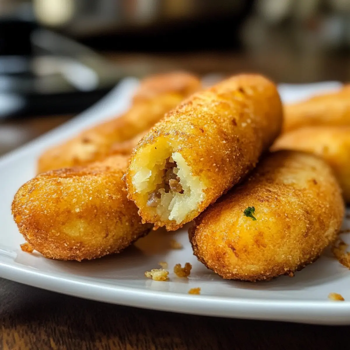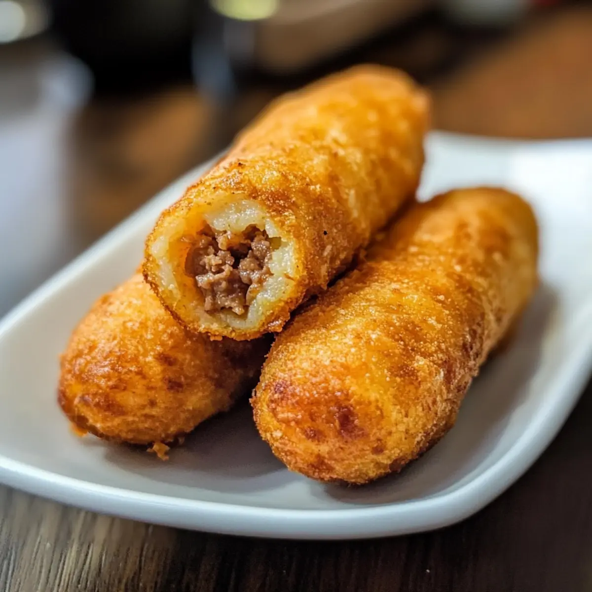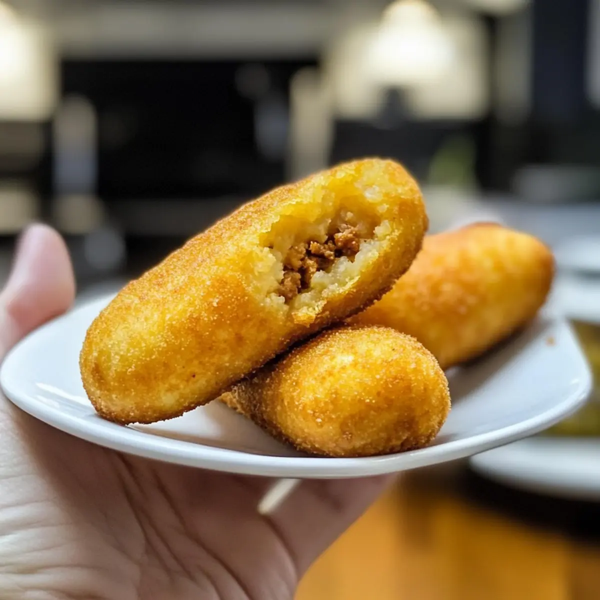 Genießen Sie diese köstlichen Yuca-Küchlein, bekannt als Carimañolas, gefüllt mit herzhaftem Rindfleisch und Gewürzen.