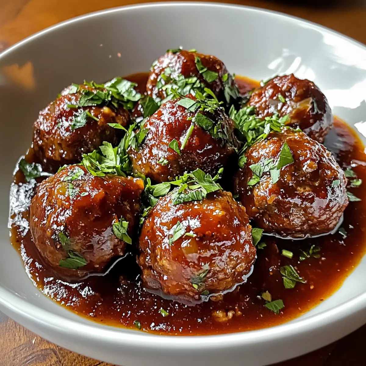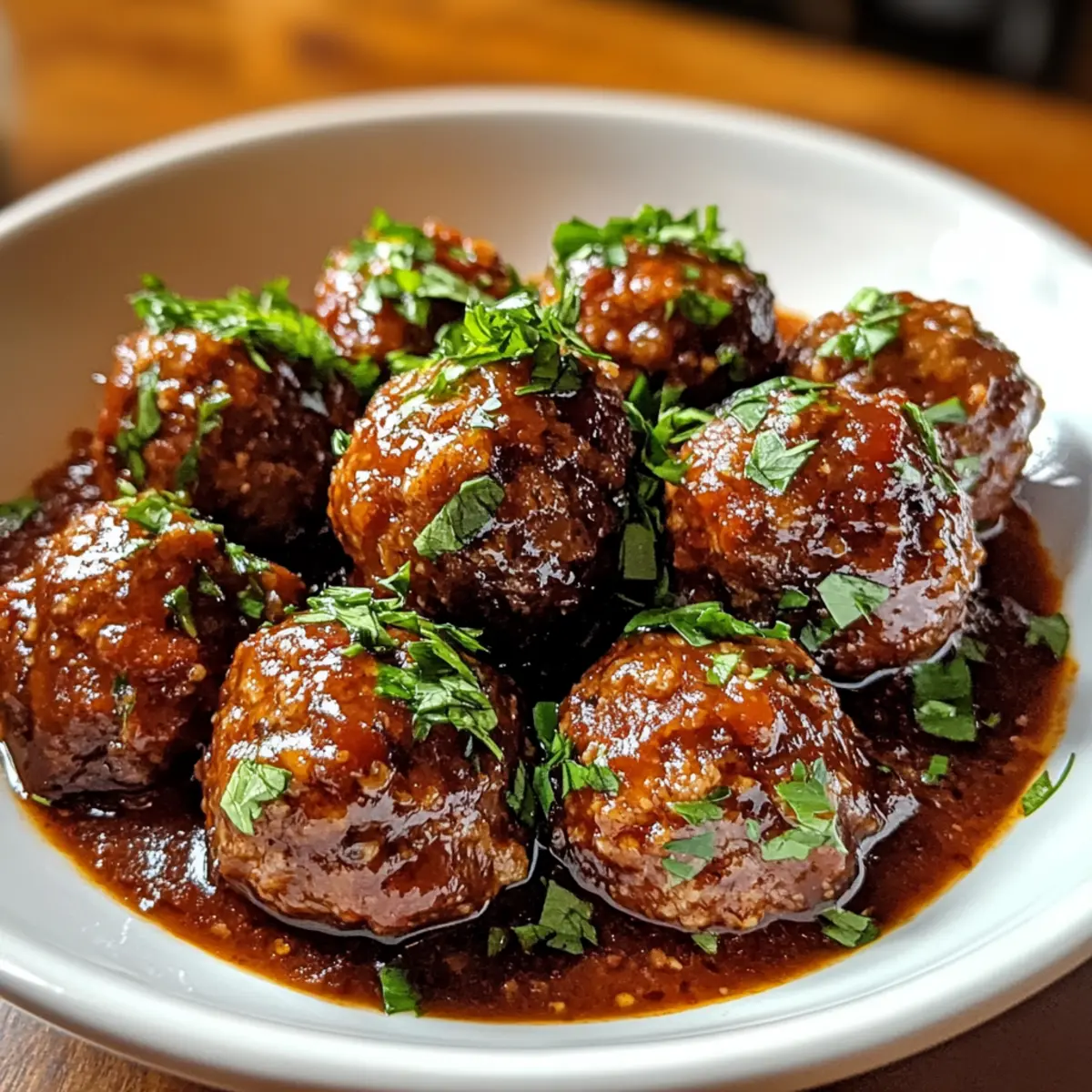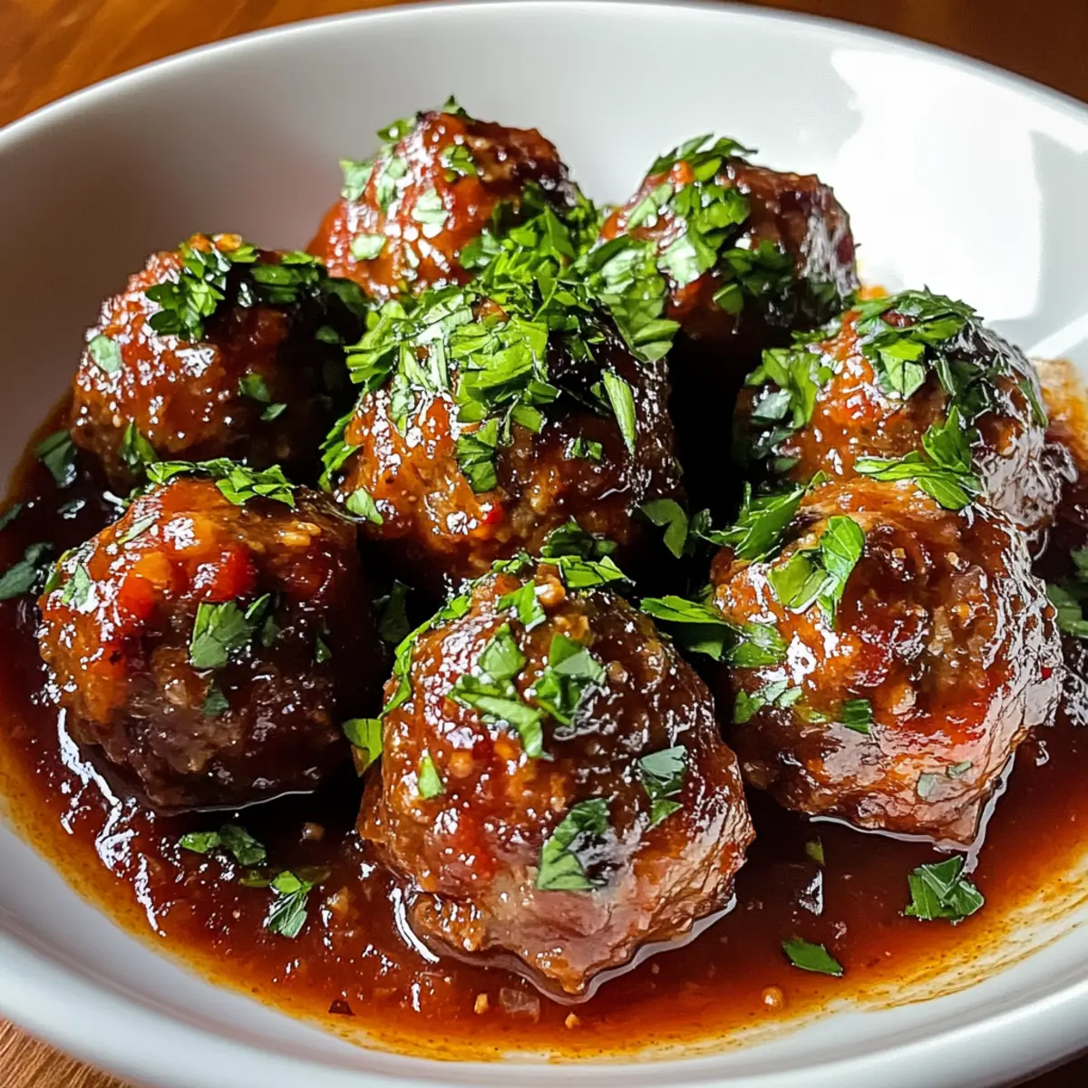 Die kühle Brise draußen weckt in mir den Wunsch nach einem warmen, gemütlichen Abendessen. Was könnte da besser passen als zarte rote Weine geschmorte Fleischbällchen? Diese kulinarische Umarmung vereint saftiges Rinder- und Schweinehackfleisch, frischen Knoblauch und aromatische Kräuter in einer reichhaltigen, vinangetränkten Tomatensauce. Perfekt für gesellige Abende oder entspannte Wochenendessen, sind diese Fleischbällchen nicht nur ein Genuss für den Gaumen, sondern auch eine ideale Möglichkeit, glutenfreie Alternativen zu integrieren. Lassen Sie uns gemeinsam in die Welt dieser herzhaften Komfortküche eintauchen – ich verspreche, dass Sie mit jedem Bissen der Sättigung und der Wärme des Hauses näher kommen. Neugierig, wie Sie dieses Gericht zubereiten können? Warum sind diese Fleischbällchen ein Muss? Zarte, saftige Konsistenz: Diese Fleischbällchen schmelzen im Mund und bieten ein unvergleichliches Geschmackserlebnis. Reichhaltige Sauce: Die Kombination aus Rotwein und Tomaten sorgt für eine tiefe, befriedigende Geschmacksnote, die begeistert. Einfache Zubereitung: Mit wenigen Zutaten und klaren Anweisungen ist das Kochen ein Kinderspiel, ideal für jeden Heimkoch. Vielseitige Beilagen: Servieren Sie sie mit Pasta, Polenta oder knusprigem Brot – jede Option passt perfekt! Glutenfreie Alternativen: Diesen Rezept müssen sich niemand entziehen; glutenfreie Breadcrumbs machen es für jeden zugänglich. Setzen Sie diese zarten roten Weine geschmorten Fleischbällchen an die erste Stelle Ihres nächsten gemütlichen Abendessens und entdecken Sie auch unsere anderen herzhaften Rezepte wie Zarte Franzoesisch Geschmorte oder Zart Geschmortes Rinderbrust! Zutaten für Zarte rote Weine geschmorte Fleischbällchen • Um Ihre Neugier zu wecken: Diese zarten roten Weine geschmorten Fleischbällchen sind das perfekte Komfortessen! Für die Fleischbällchen Rinderhackfleisch – die Hauptproteinquelle, die für reichhaltigen Geschmack sorgt; für eine leichtere Variante kann auch Putenhack verwendet werden, aber zusätzliches Fett ist ratsam. Schweinehackfleisch – fügt Feuchtigkeit und eine tiefere Geschmacksnote hinzu; Experimentieren mit anderen Fleischsorten ist möglich. Semmelbrösel – trägt zur Struktur bei; verwenden Sie glutenfreie Semmelbrösel oder gemahlene Haferflocken für eine glutenfreie Option. Geriebener Parmesan – verstärkt den Geschmack und sorgt für zusätzliche Feuchtigkeit; keine Substitution empfohlen. Eier – fungiert als Bindemittel; unverzichtbar für die Stabilität der Fleischbällchen. Gehackter Knoblauch – für ein aromatisches Aroma; frischer Knoblauch ist ideal, Knoblauchpulver als Alternative möglich. Frische gehackte Petersilie – bringt Frische und Farbe; kann auch durch andere Kräuter wie Basilikum oder Koriander ersetzt werden. Salz und Pfeffer – unerlässlich für die Würze; nach Geschmack anpassen, Knoblauchsalz für zusätzlichen Geschmack nutzen. Für die Sauce Olivenöl – zum Anbraten der Fleischbällchen; kann durch Avocadoöl ersetzt werden. Zwiebel – fügt Süße und Tiefe hinzu; gelbe oder weiße Zwiebel können austauschbar verwendet werden. Rotwein – sorgt für Tiefe und Reichhaltigkeit; wählen Sie einen mitteltrockenen Wein wie Merlot oder Cabernet Sauvignon, süße Varianten vermeiden. Rinderbrühe – bildet die Basis der Schmorflüssigkeit; Gemüsebrühe für einen leichteren Geschmack ist ebenfalls möglich. Gestückelte Tomaten – sorgt für Säure und Körper in der Sauce; frisch oder als Tomatenpüree kann auch verwendet werden. Tomatenmark – intensiviert den Tomatengeschmack; unverzichtbar für den Reichtum der Sauce. Getrockneter Oregano und getrockneter Basilikum – bereichern das Gericht mit Kräuternoten; frische Kräuter können verwendet werden, aber in größeren Mengen. Nutzen Sie diese Zutaten, um eine köstliche Portion Ihrer eigenen zarten roten Weine geschmorten Fleischbällchen zuzubereiten – Ihre Familie wird begeistert sein! Schritt-für-Schritt-Anleitungen für Zarte rote Weine geschmorte Fleischbällchen Step 1: Fleischbällchen vorbereiten In einer großen Schüssel das Rinderhackfleisch, das Schweinehackfleisch, die Semmelbrösel, den geriebenen Parmesan, die Eier, den gehackten Knoblauch, die Petersilie, das Salz und den Pfeffer gut vermengen. Achten Sie darauf, alle Zutaten gleichmäßig zu verteilen, bis eine homogene Masse entsteht. Dies dauert etwa 5 Minuten, aber es lohnt sich, um die Aromen zu vermischen. Step 2: Fleischbällchen formen Formen Sie aus der Mischung kleine Fleischbällchen von etwa 2 bis 4 cm Durchmesser. Achten Sie darauf, dass sie gleich groß sind, damit sie gleichmäßig garen. Legen Sie die geformten Fleischbällchen auf einen Teller und stellen Sie sicher, dass sie genug Platz haben, um beim Braten nicht zusammenzukleben. Step 3: Fleischbällchen anbraten Erhitzen Sie in einer großen Pfanne bei mittlerer Hitze etwas Olivenöl. Sobald das Öl heiß ist, die Fleischbällchen mit genügend Abstand zueinander in die Pfanne geben. Braten Sie sie für etwa 2-3 Minuten pro Seite an, bis sie goldbraun sind. Entfernen Sie die Fleischbällchen nach dem Braten und legen Sie sie auf einen Teller. Step 4: Zwiebel anbraten Geben Sie die gehackte Zwiebel in die gleiche Pfanne und braten Sie sie bei mittlerer Hitze für etwa 5 Minuten an. Rühren Sie regelmäßig um, bis die Zwiebel weich und glasig ist. Diese Schritte bringen die Aromen heraus und bilden die Grundlage für die Soße der zarten roten Weine geschmorten Fleischbällchen. Step 5: Rotwein hinzufügen Gießen Sie den Rotwein in die Pfanne, um die Pfanne abzulöschen. Kratzen Sie mit einem Holzlöffel die braunen Reste vom Boden der Pfanne ab und bringen Sie die Mischung zum Kochen. Lassen Sie den Wein für einige Minuten köcheln, bis sich die Menge um etwa ein Drittel reduziert hat, damit die Aromen intensiv werden. Step 6: Tomatensoße zubereiten Fügen Sie die Rinderbrühe, die gestückel