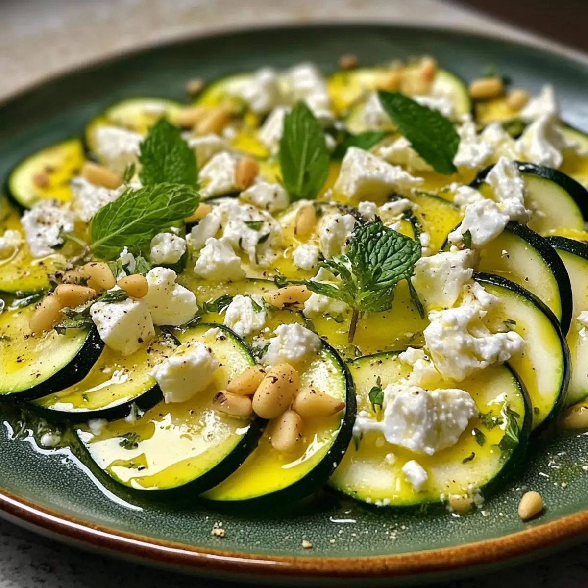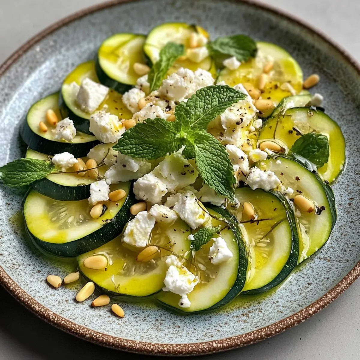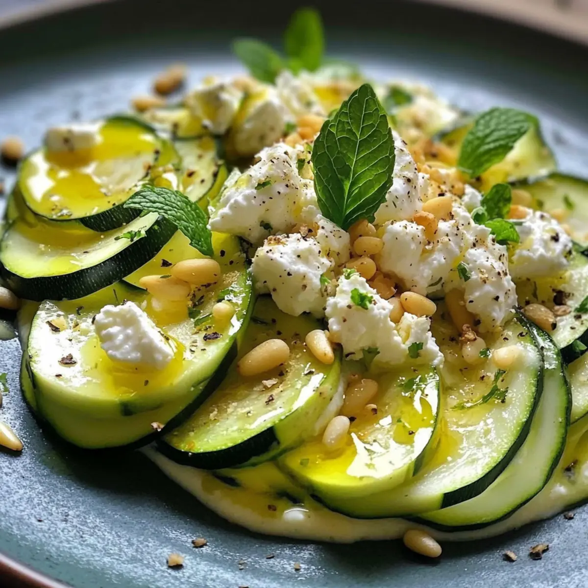 Wenn die Temperaturen steigen und die Sonne strahlt, sehne ich mich nach leichten Gerichten, die frisch und unkompliziert sind. Mein Rezept für Zucchini-Carpaccio mit Feta und Pinienkernen ist genau das – ein wunderbarer Genuss, der in nur 15 Minuten zubereitet ist. Diese köstliche Kombination aus zarten Zucchinischeiben, spritzigem Zitronenöl und dem herzhaften Geschmack von Feta macht es zum perfekten Begleiter für Grillabende oder einfach als erfrischendes Mittagessen. Zusätzlich kommt dieses vegetarische Gericht ohne großen Aufwand aus, sodass Sie mehr Zeit mit Ihren Liebsten verbringen können. Neugierig, wie dieses Sommerhighlight auf Ihrem Tisch zur Geltung kommt? Warum ist Zucchini-Carpaccio so beliebt? Frische Einfachheit: Zucchini-Carpaccio ist das perfekte Gericht für heiße Sommertage – schnell, gesund und voller Geschmack. Erfrischend und leicht: Die Kombination aus Zucchini, zitrusfrischem Dressing und cremigem Feta bringt den Sommer direkt auf Ihren Teller. Unkomplizierte Zubereitung: In nur 15 Minuten haben Sie ein schickes Gericht, das sowohl als Vorspeise als auch als Beilage glänzt. Vielseitigkeit: Transformieren Sie das Rezept ganz nach Ihrem Geschmack, indem Sie z.B. gegrillte Hähnchenstreifen hinzufügen oder es mit einem leichten Bulgur-Salat kombinieren. Außerdem ist dieses Rezept nicht nur vegetarisch, sondern auch einfach in der Vorbereitung – so bleibt mehr Zeit für Geselligkeit. Machen Sie sich bereit, Ihre Gäste zu beeindrucken und genießen Sie diese köstliche mediterrane Kreation! Zucchini-Carpaccio Zutaten Für das Carpaccio • Zucchini – Verwenden Sie feste und frische Zucchini für die beste Textur und Geschmack. • Zitrone – Sorgt für Frische und Säure; verwenden Sie sowohl Saft als auch Schale. • Feta-Käse – Fügt einen salzigen und cremigen Kontrast zur Zucchini hinzu. • Pinienkerne – Für einen knackigen und nussigen Geschmack; leicht anrösten für mehr Aroma. • Olivenöl (extra vergine) – Essentiell für das Dressing und zur Geschmacksverstärkung. • Salz und Pfeffer – Grundwürze: nach Geschmack anpassen. • Frische Minze oder Basilikum – Für zusätzliche Frische und Aroma; auch andere Kräuter wie Petersilie sind möglich. Für die Marinade • Zitronensaft – Für die perfekte Säurebalance im Zucchini-Carpaccio. • Zitronenschale – Verstärkt den frischen Zitronengeschmack. Schritt-für-Schritt-Anleitung für Zucchini-Carpaccio Step 1: Zucchini vorbereiten Waschen Sie die Zucchini gründlich und schneiden Sie sie mit einem Mandolinenschneider oder einem scharfen Messer in sehr dünne Scheiben. Achten Sie darauf, gleichmäßige Runden zu erzielen, um eine gleichmäßige Marinierung zu gewährleisten. Diese frischen Zucchinischeiben bilden die Grundlage für Ihr erfrischendes Zucchini-Carpaccio. Step 2: Marinade zubereiten In einer kleinen Schüssel kombinieren Sie den frisch gepressten Zitronensaft, die abgeriebene Zitronenschale, das extra vergine Olivenöl, Salz und Pfeffer. Rühren Sie die Mischung gut um, bis alles gut vermengt ist. Diese Marinade wird dem Zucchini-Carpaccio einen spritzigen Geschmack verleihen und die Aromen perfekt abrunden. Step 3: Zucchini marinieren Legen Sie die dünnen Zucchinischeiben in eine große Schüssel und gießen Sie die vorbereitete Marinade darüber. Vorsichtig umdrehen, damit jede Scheibe gleichmäßig mit der Marinade bedeckt ist. Lassen Sie das Ganze etwa 10 Minuten ziehen, damit die Aromen gut in die Zucchini einziehen und die Zucchini bei Raumtemperatur zart werden. Step 4: Anrichten Sobald die Zucchini gut mariniert ist, richten Sie die Zucchinischeiben fächerartig auf einem großen Servierteller an. Achten Sie darauf, dass die Scheiben überlappen, um eine schöne Präsentation zu erzielen. Diese Anrichtetechnik verleiht Ihrem Zucchini-Carpaccio ein elegantes Aussehen, ideal für jeden Anlass. Step 5: Feta und Pinienkerne hinzufügen Bestreuen Sie das Zucchini-Carpaccio gleichmäßig mit zerbröckeltem Feta-Käse und den zuvor leicht angerösteten Pinienkernen. Diese Zutaten sorgen für einen cremigen und nussigen Geschmack, der das Gericht wunderbar ergänzt. Das Kontrastieren der Texturen macht das Carpaccio noch köstlicher. Step 6: Garnieren und Servieren Zum Schluss garnieren Sie das Zucchini-Carpaccio mit frischen Minz- oder Basilikumblättern. Diese Kräuter bringen zusätzliches Aroma und Farbe ins Spiel. Servieren Sie das Gericht sofort oder kühlen Sie es für einige Minuten, um es noch erfrischender zu genießen – perfekt für heiße Sommertage! Zucchini-Carpaccio Variationen und Alternativen Lassen Sie Ihrer Kreativität freien Lauf und passen Sie dieses Rezept ganz nach Ihrem Geschmack an! Hier sind einige verlockende Variationen, die Ihr Zucchini-Carpaccio noch interessanter machen. Mediterrane Einlage: Fügen Sie geschnittene schwarze Oliven oder getrocknete Tomaten hinzu, um dem Gericht eine herzhaftere Note zu verleihen. Protein-Power: Servieren Sie das Carpaccio mit gegrillten Hähnchenstreifen für eine sättigende Hauptspeise, die auch die Proteinaufnahme erhöht. Nussfrei: Ersetzen Sie die Pinienkerne durch geröstete Sonnenblumenkerne, wenn Sie eine nussfreie Variante wünschen. Diese bieten ebenfalls einen schönen Crunch. Käsealternative: Ersetzen Sie den Feta-Käse durch Ziegenkäse oder Ricotta salata für unterschiedliche Geschmacksrichtungen und Texturen. Jeder Käse bringt seinen eigenen Charakter ins Spiel. Würzige Note: Fügen Sie etwas Chili-Flocken oder frisch gehackte rote Paprika hinzu, um dem Carpaccio eine angenehme Schärfe zu verleihen. Es sorgt für das gewisse Etwas! Kräuterwechsel: Experimentieren Sie mit verschiedenen frischen Kräutern wie Dill oder Koriander anstelle von Minze oder Basilikum. Diese können überraschend frische Geschmacksrichtungen bieten. Extra Gemüse: Integrieren Sie dünn geschnittene Radieschen oder Karotten für zusätzliche Farbtupfer und Crunch im Carpaccio. Diese Gemüsesor